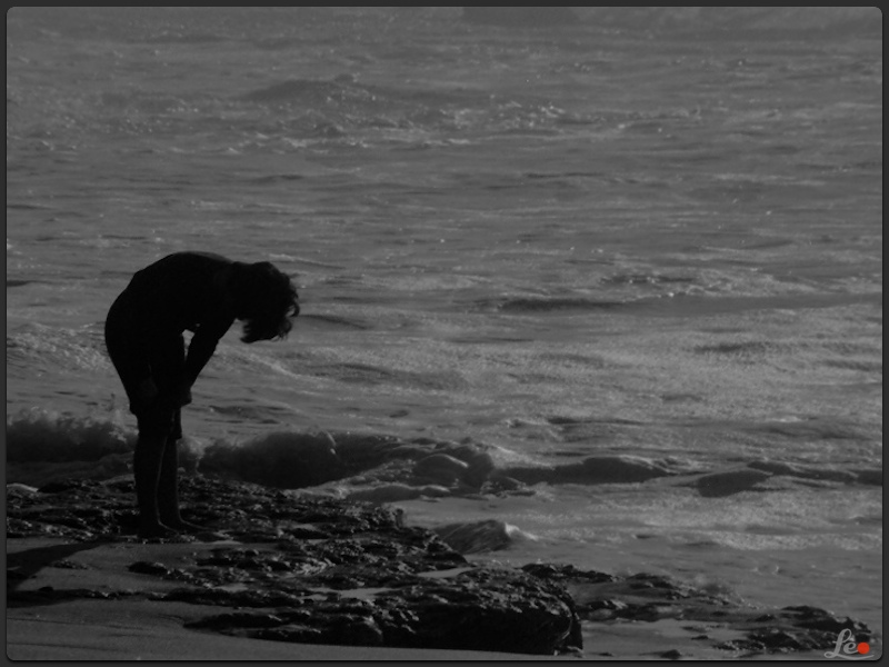 um homem passeia á beira mar sob as pedras da praia.